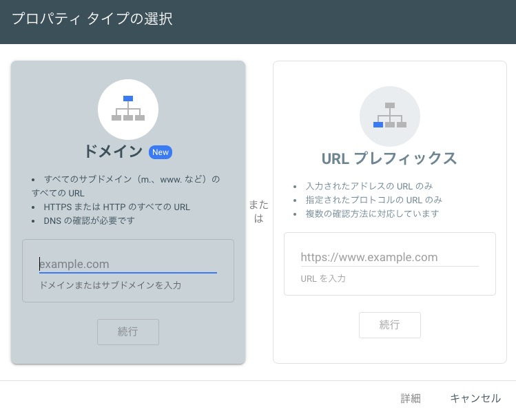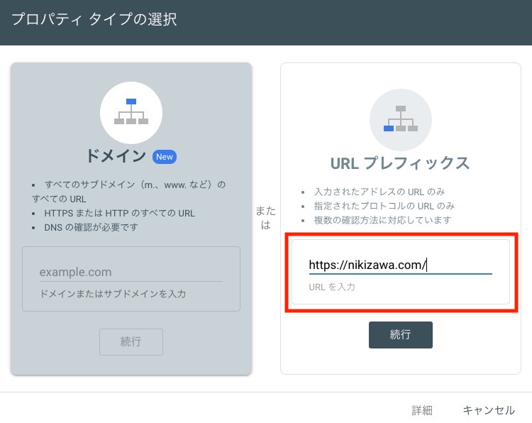 こういう画面が出てきたら、左側の「ドメイン」ではなく、右側の「URLプレフィックス」に登録するWordPressサイト(ブログ)のURLを貼り付けてください。